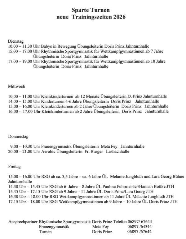 9.00-10.30 Uhr Frauengymnastik Übungsleiterin Fr. Meta Fey